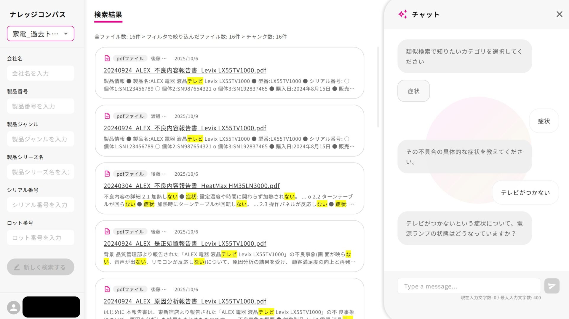 実際の問い合わせ対応では、製品名や症状を入力するだけで、関連するマニュアルや注意点を即座に確認でき、資料を探す手間が大幅に削減されています。